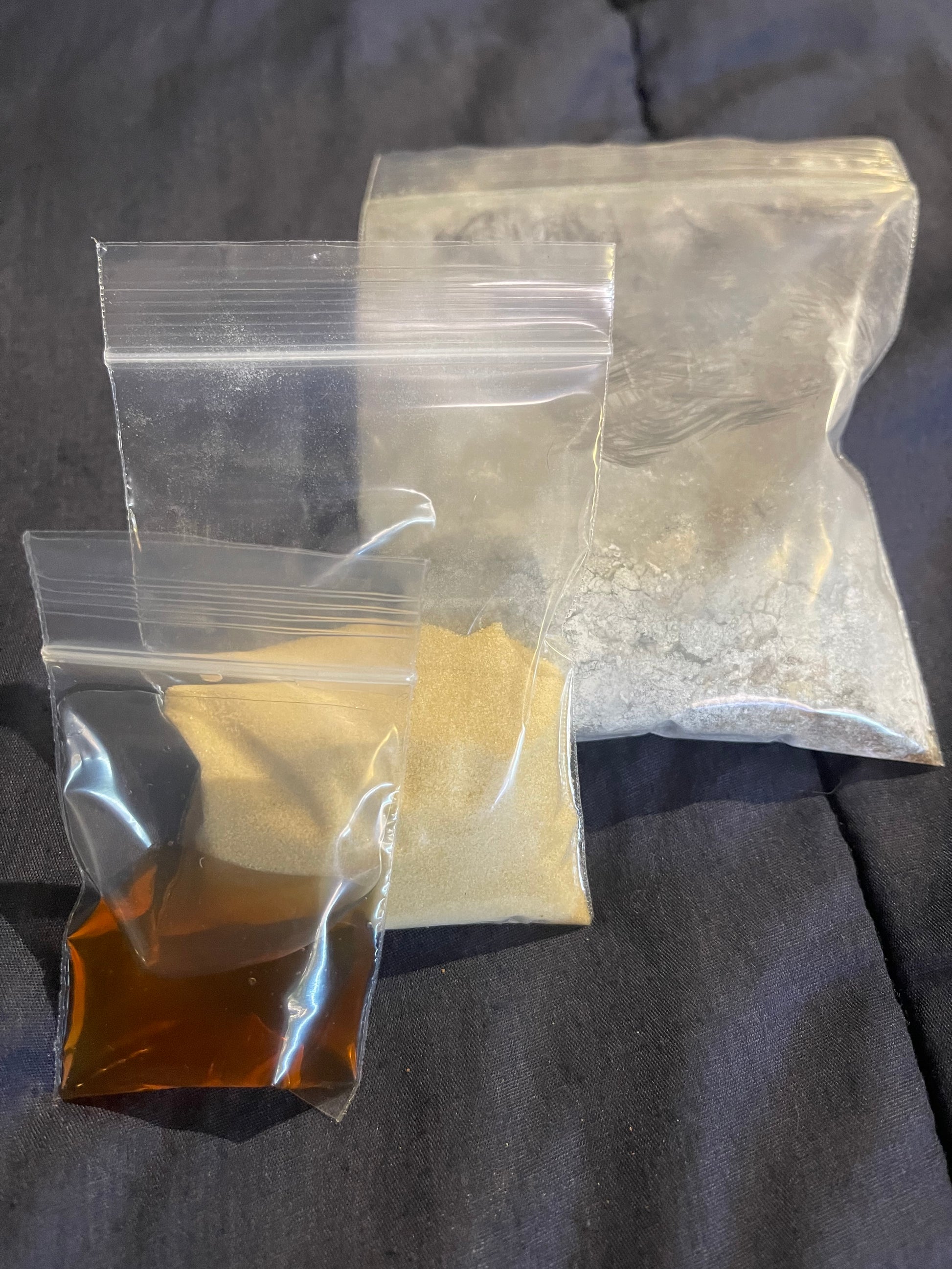 1 packet dry mix (calcium carbonate, spiralina, fish food pellets, fish flakes, freeze dried mysis shrimp, freeze dried bug mix)