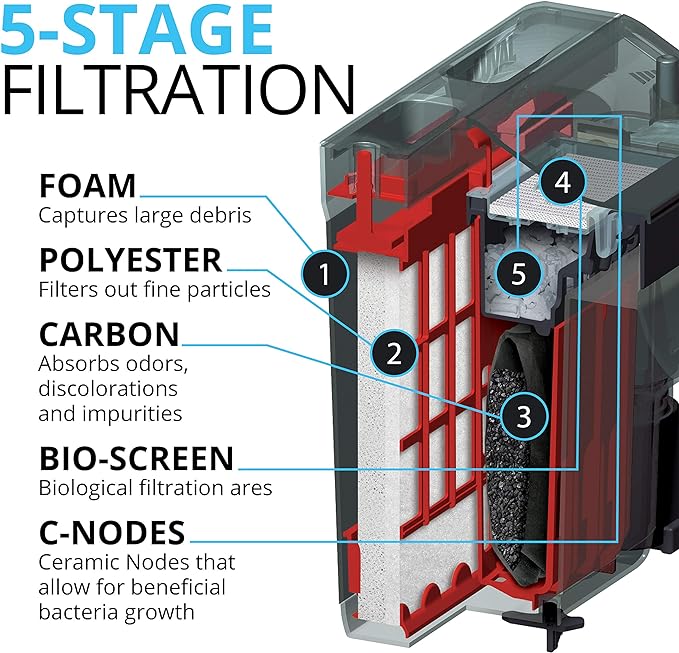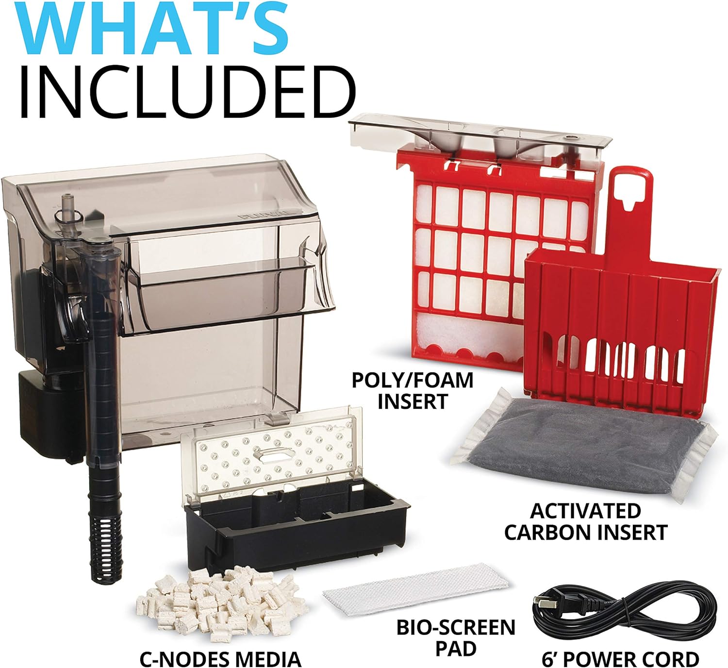 The Fluval Power filter is a good filter with excellent filtration. We recently had one of our generic HOBs break down and needed a new one for our house plants. We decided on the C4 variant that is good for 40 - 70 gallon aquariums. This filter features an adjustable flow, a maintenance reminder for when the sponge is clogged and an adjustable intake tube. It has 5 levels of filtration foam for larger debris, polyester for fine materials. Carbon, we dont personally use carbon in ours, bio screen and c-nodes for beneficial bacteria growth.
