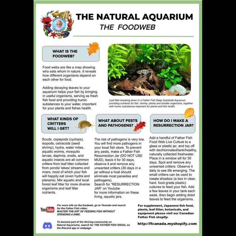 Setting up a resurrection jar is a crucial part of having a Father Fish style aquarium, as well as just being an awesome experiment. Go to your local creek, lake, pond, river and bring a jar or container. Fill it up with water, add some wet leaf muck and a couple small sticks, cover it with something breathable and let it sit. Check back and see what life your jar has grown, doing this allows you to also make sure you aren't adding unwanted pests to your tank and only critters you do want. Presoaking leaves in your jar before transferring to your tank will help you to collect micro fauna for your aquarium.